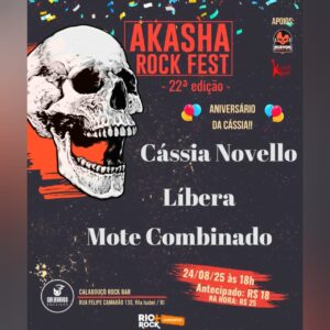 A próxima edição do Akasha Rock Fest acontece neste domingo, (24/08), no Calabouço Rock Bar em Vila Isabel (RJ), com as bandas independentes Cássia Novello, Mote Combinado e Líbera. Nessa